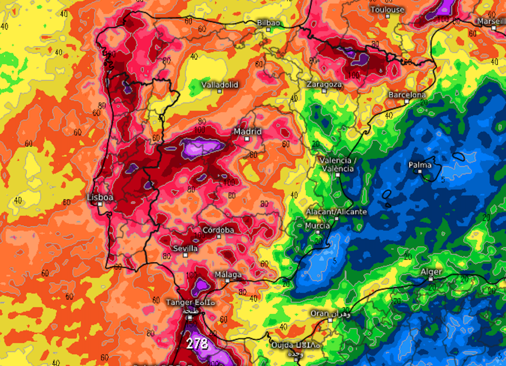 Y lluvia, mucha lluvia. Todo parece apuntar a que una larga sucesión de frentes va a barrer la península desde este lunes hasta el fin de semana. Es verdad que el levante, de nuevo, no recibirá mucha agua. Pero con acumulados que llegan a los 200mm en muchas zonas y la amplitud y fuerza de los frentes, parece claro que va a llover en abundancia y casi todos los días en la mayor parte del país.